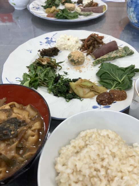 フキの葉ご飯包み、ノビルのお焼き、ノビルと油揚げの煮物、タンポポの葉サラダ、